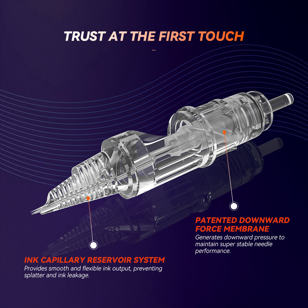 Découvrez une expérience de tatouage supérieure avec les cartouches d'aiguilles de tatouage Round Shader de la série AWE, dotées à la fois de notre réservoir capillaire et de notre membrane brevetés.