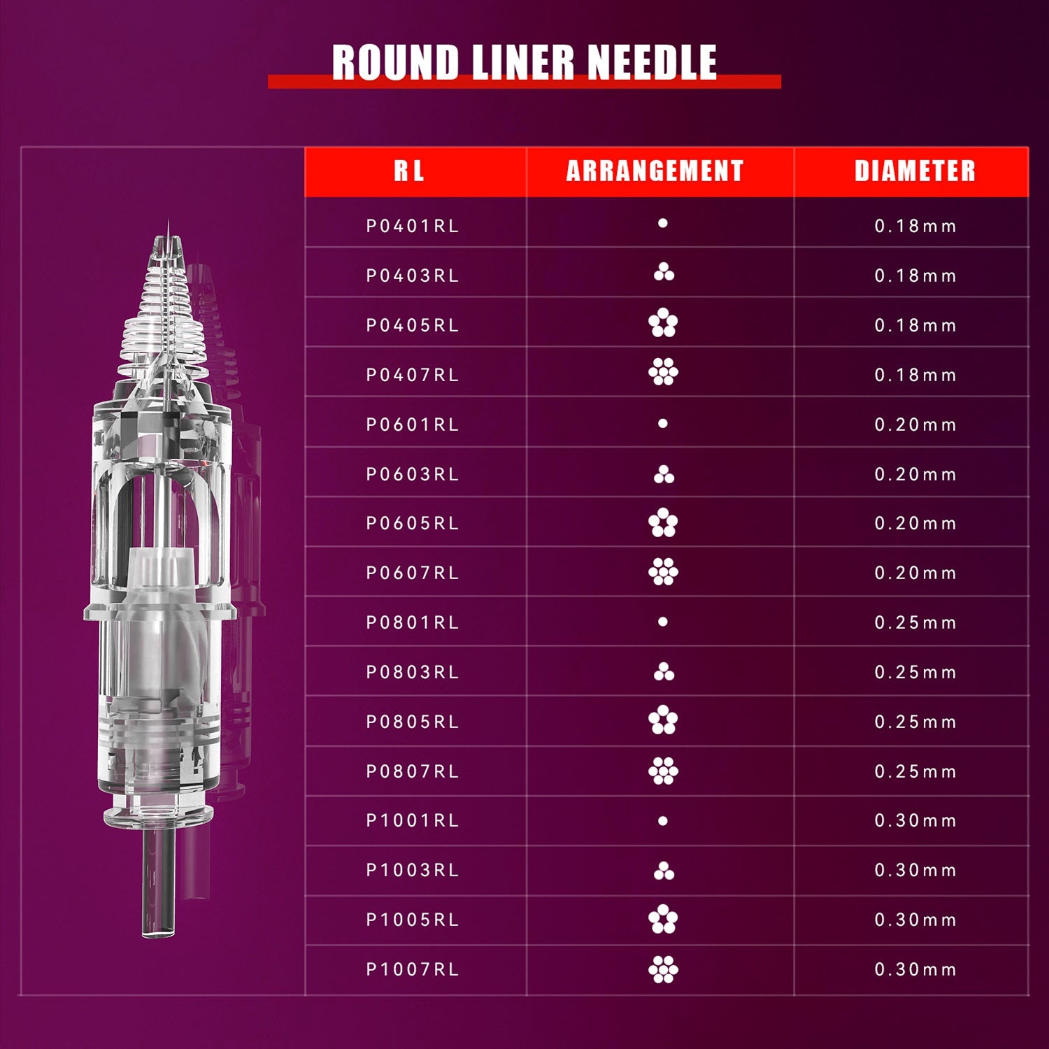 | 0.25 mm needle cartridges designed for faster pigment saturation, perfect for dense ombre brows, bold eyeliner, and lip shading. Available in 1RL, 3RL, 5RL, and 7RL sizes. |